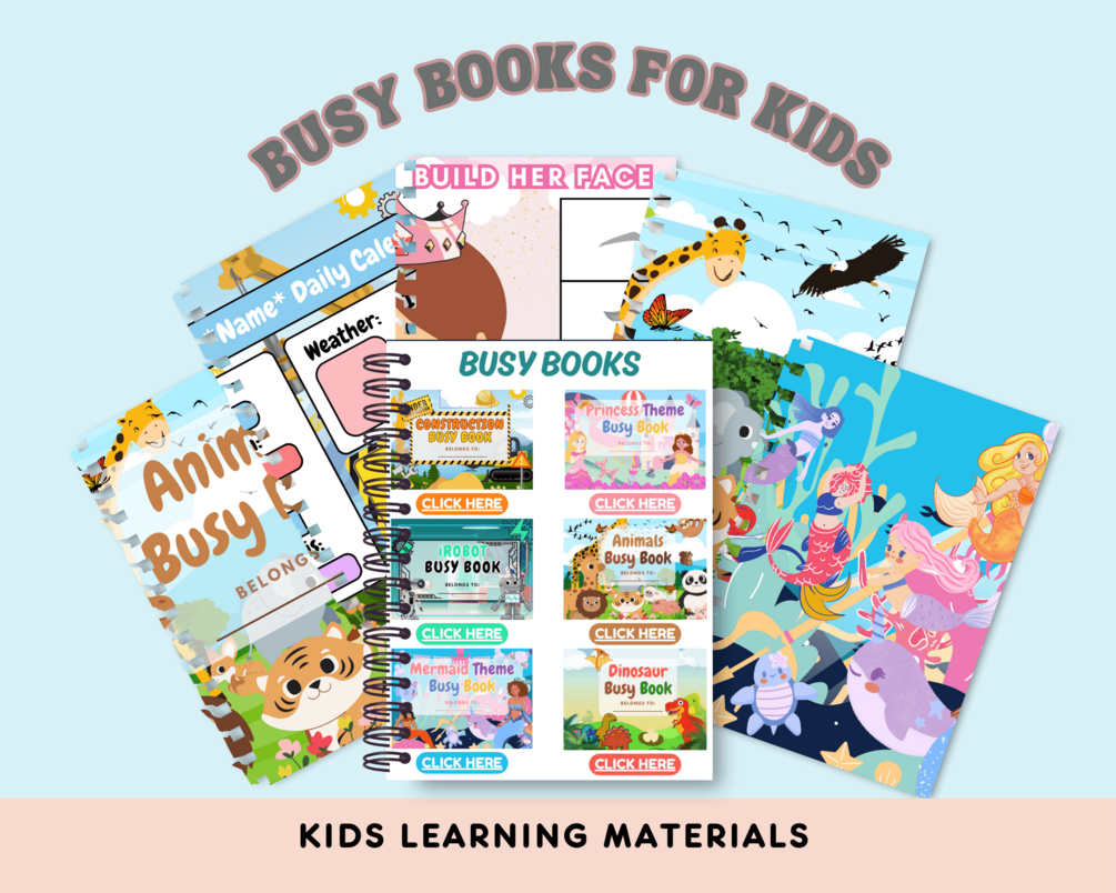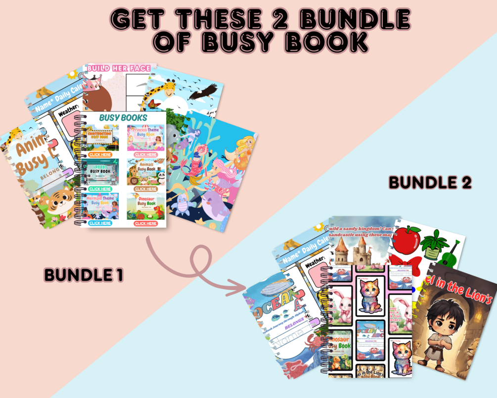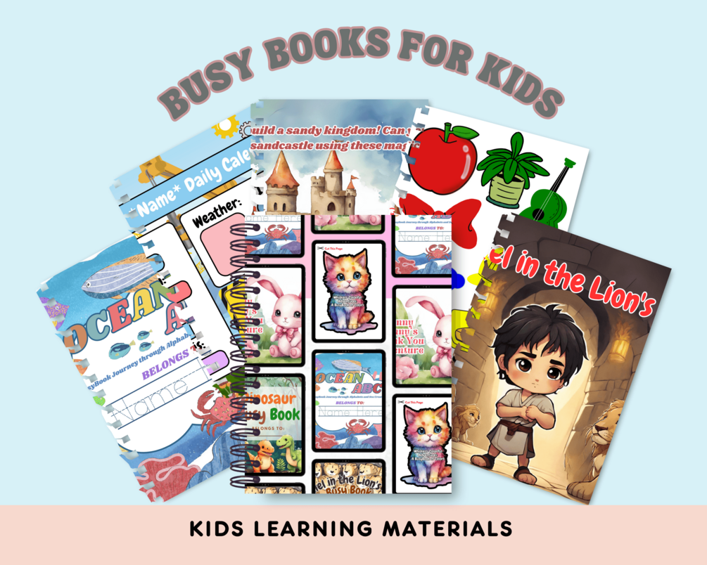 Busy books are interactive and hands-on learning tools designed for young children to engage in educational and entertaining activities. Each of the mentioned busy booksβBunny Busy Book, Daniel in the Lion's Den Busy Book, Dinosaur Busy Book, Whiskers Busy Book, and Ocean Theme Busy Bookβlikely follows a similar format with unique content tailored to its theme. Here's a brief description of each: